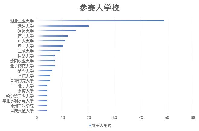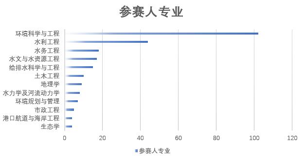 截至2019年10月16日,第二屆全國大學生水環境模型模擬大賽已圓滿落幕。本次大賽共得到了來自63所高校近300名同學的積極響應,其中參賽人數最多的是湖北工業大學,共有49人參賽,其它參賽人數較多的大學還包括河海大學、山東大學和三峽大學等(圖1);參賽選手所屬的專業方向共20個,其中環境科學與工程(102人)與水利工程(44人)方向的參賽同學占主導(圖2)。
