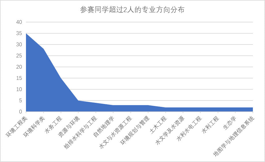截止2021年10月11日,第四屆全國大學生水環(huán)境模型模擬大賽已圓滿落幕。本次大賽共得到了來自45所高校150余名同學的積極響應,其中參賽人數(shù)最多的是湖北工業(yè)大學,共有35人參賽,其它參賽人數(shù)較多的大學還包括長江大學、河海大學、廣州大學、哈爾濱工業(yè)大學、南京大學、廣東工業(yè)大學、中山大學、四川大學、太原理工大學、北京大學等(圖1);參賽選手所屬的專業(yè)方向共41個,其中環(huán)境工程類與環(huán)境科學類(共計63人)方向的參賽同學占主導(圖2)。截止2021年10月11日,第四屆全國大學生水環(huán)境模型模擬大賽已圓滿落幕。本次大賽共得到了來自45所高校150余名同學的積極響應,其中參賽人數(shù)最多的是湖北工業(yè)大學,共有35人參賽,其它參賽人數(shù)較多的大學還包括長江大學、河海大學、廣州大學、哈爾濱工業(yè)大學、南京大學、廣東工業(yè)大學、中山大學、四川大學、太原理工大學、北京大學等(圖1);參賽選手所屬的專業(yè)方向共41個,其中環(huán)境工程類與環(huán)境科學類(共計63人)方向的參賽同學占主導(圖2)。